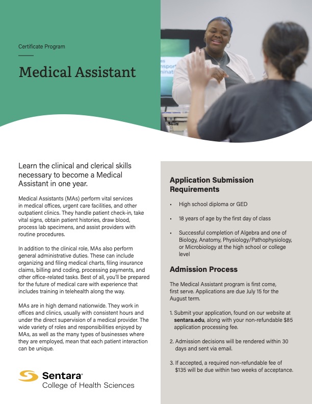 - Prepares you to work as a Medical Assistant at Sentara or nationwide.